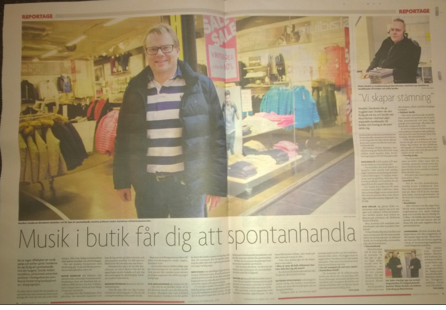 I dagens Karlstads Tidning kan man läsa om hur musiken i butik får dig att öppna upp plånboken och spontanhandla. Professor Anders Gustavsson Från Centrum för Tjänsteforskning fastslår att det faktiskt fungerar så. "Musik handlar om känslor och med rätt musik kan känslorna utnyttjas kommersiellt. Musiken påverkar även vårat rörelsemönster, den får upp eller ned dig om den är rätt designad".
